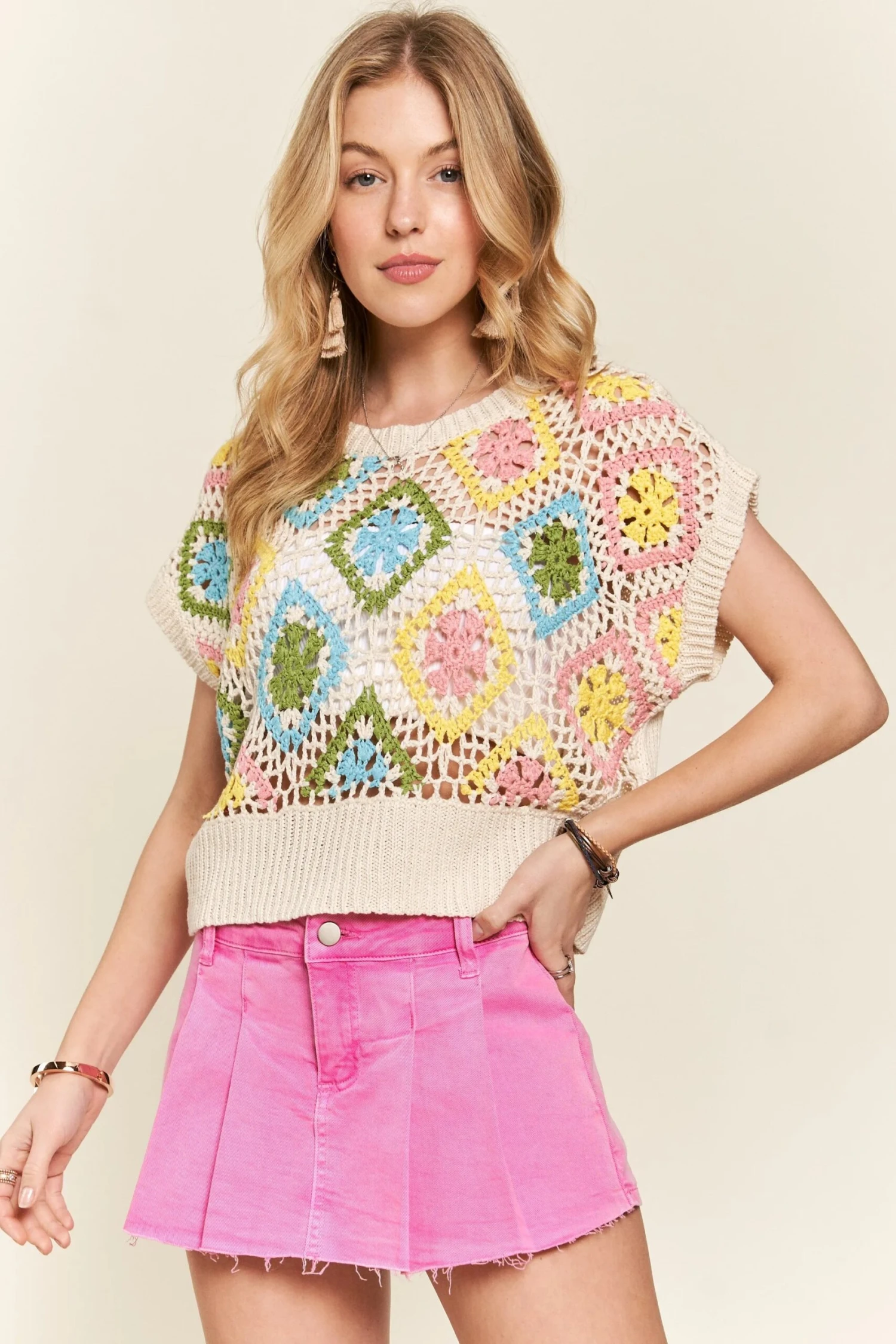 The multicolor crochet top is a vibrant and eye-catching addition to your wardrobe. With its array of colors, this top exudes a fun and playful vibe. The crochet detailing adds a touch of texture and bohemian charm to the design. Pair it with shorts or a skirt for a stylish and summery look. Embrace the colorful and trendy appeal of this multicolor crochet top for a chic and standout outfit.