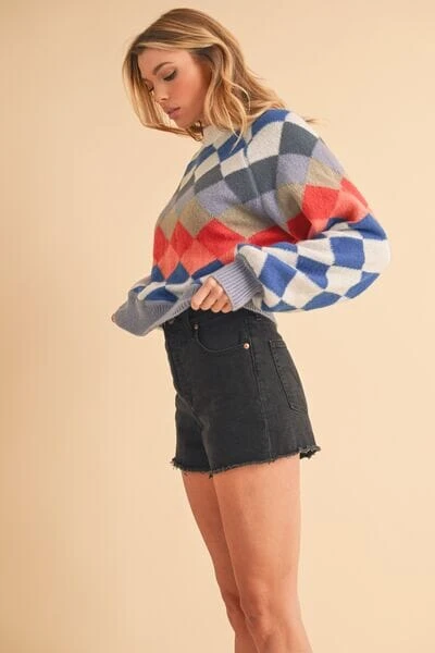 The Diamond Mock Neck Raglan Sleeve Sweater is a chic and stylish piece featuring a diamond pattern design, a mock neckline, and raglan sleeves. The mock neck adds a trendy and sophisticated touch, while the raglan sleeves provide a sporty and casual look to the sweater. The diamond pattern adds a fashionable and eye-catching detail to the overall design.