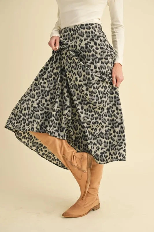 A leopard midi skirt is a trendy and versatile piece for adding a touch of animal print to your wardrobe. The midi length falls below the knee, offering a chic and flattering silhouette suitable for various occasions. The leopard print design adds a bold and stylish statement to your outfit, perfect for dressing up or down with different tops and accessories. Pair this skirt with a simple blouse or a graphic tee for a fashion-forward look.