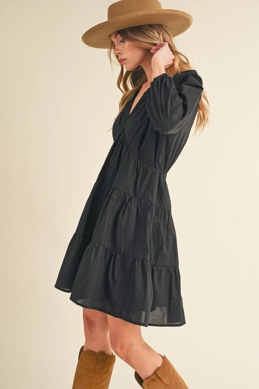 The Notched Balloon Sleeve Tiered Mini Dress is a trendy and chic piece featuring unique notched balloon sleeves and tiered detailing. The notched design adds a stylish and modern touch to the classic balloon sleeves, while the tiered layers create a flirty and playful look. This mini dress is perfect for a fun and fashionable outfit, suitable for various occasions. Pair it with heels or boots for a stylish ensemble that is sure to make a statement.