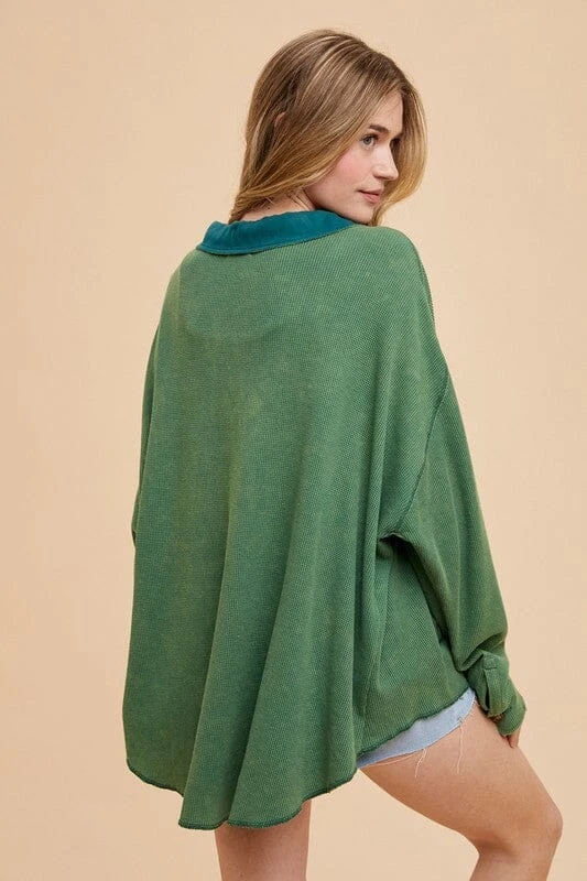 The Waffle-Knit Mineral Washed Button Down Shirt is a stylish and unique piece. The waffle-knit texture adds a cozy and tactile element to the shirt. The mineral washed finish gives it a trendy and slightly distressed look. With summary-down detailing, this shirt offers a classic and versatile style. This shirt is perfect for adding a touch of texture and character to your outfit, whether worn casually with jeans or layered over a tee for a relaxed yet fashionable look.