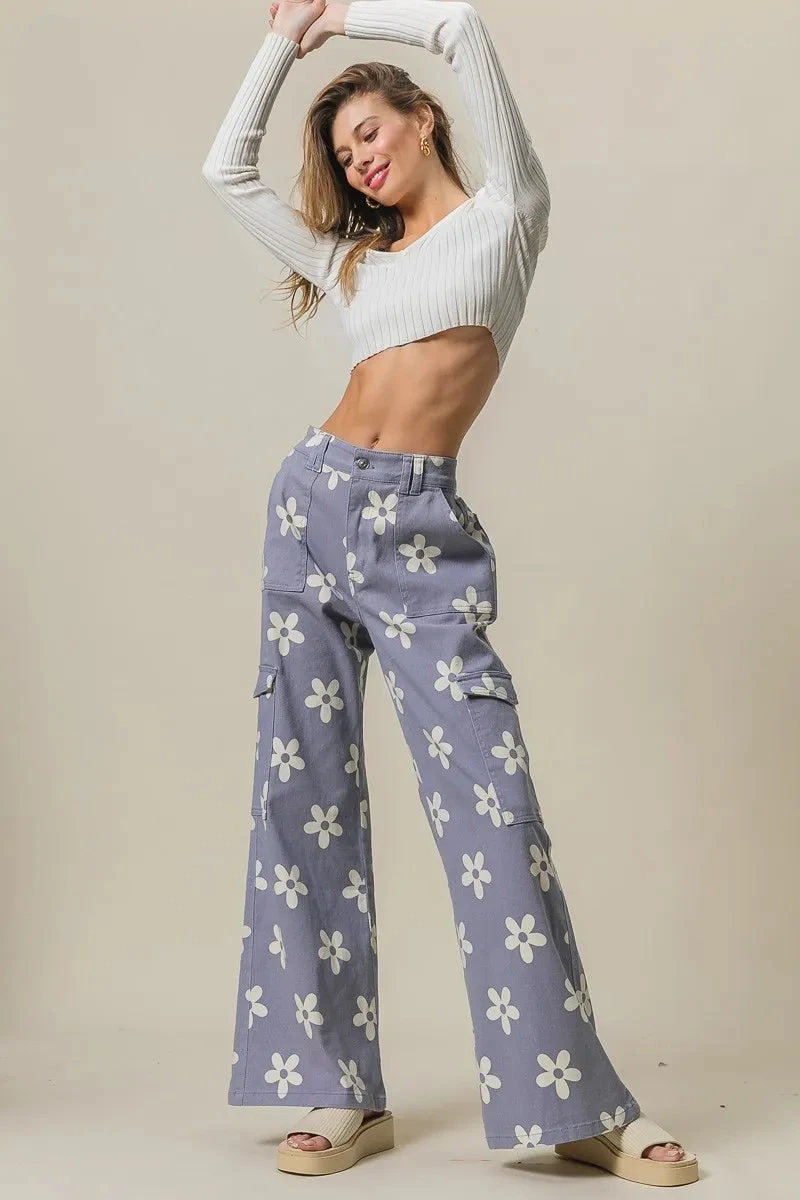 These wide pants feature a charming flower print design and are equipped with convenient side pockets for added functionality. The floral pattern adds a touch of whimsy and femininity to the pants, while the wide-leg silhouette offers a stylish and comfortable fit. Perfect for a casual yet trendy look, these pants can be paired with a simple top or blouse for a fashionable ensemble.