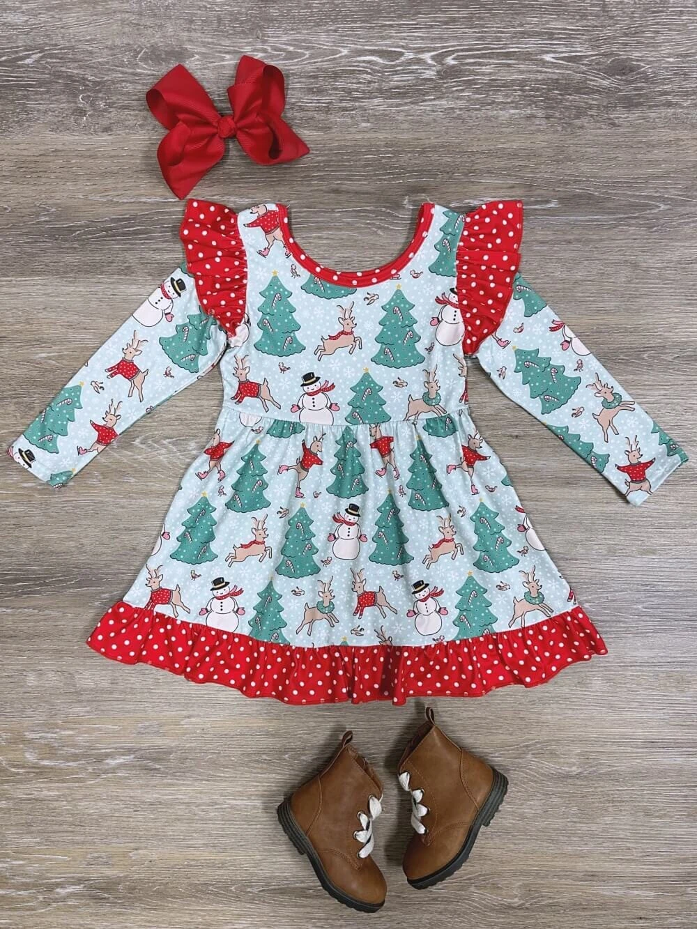 Our Christmas Dreams Reindeer & Snowman Ruffle Trim Girls Dress is perfect for holiday festivities! This green dress features an adorable print of reindeer and snowmen, creating a festive look she’ll love. Accented with a playful red polka dot ruffle trim, it’s a delightful outfit choice for celebrating the season with charm and holiday cheer. And be sure to check out our other must have new arrivals.