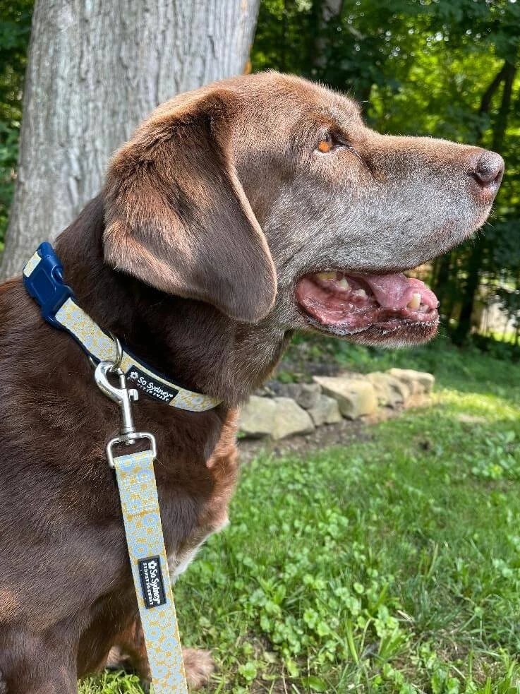 Daisies, daisies, and more daisies! Get your little furry friend in the floral mood with our adorable Daisy Navy Dog Collar! This trendy yellow collar features a daisy print with coordinating navy trim! This collar would look adorable with our coordinating leash or a solid yellow or navy leash! This collar is perfect for the spring or summer season or it can be worn all year long! We are loving the vibrant colors in this collar and know that you will too! This is an adorable dog approved look for your fur friend.