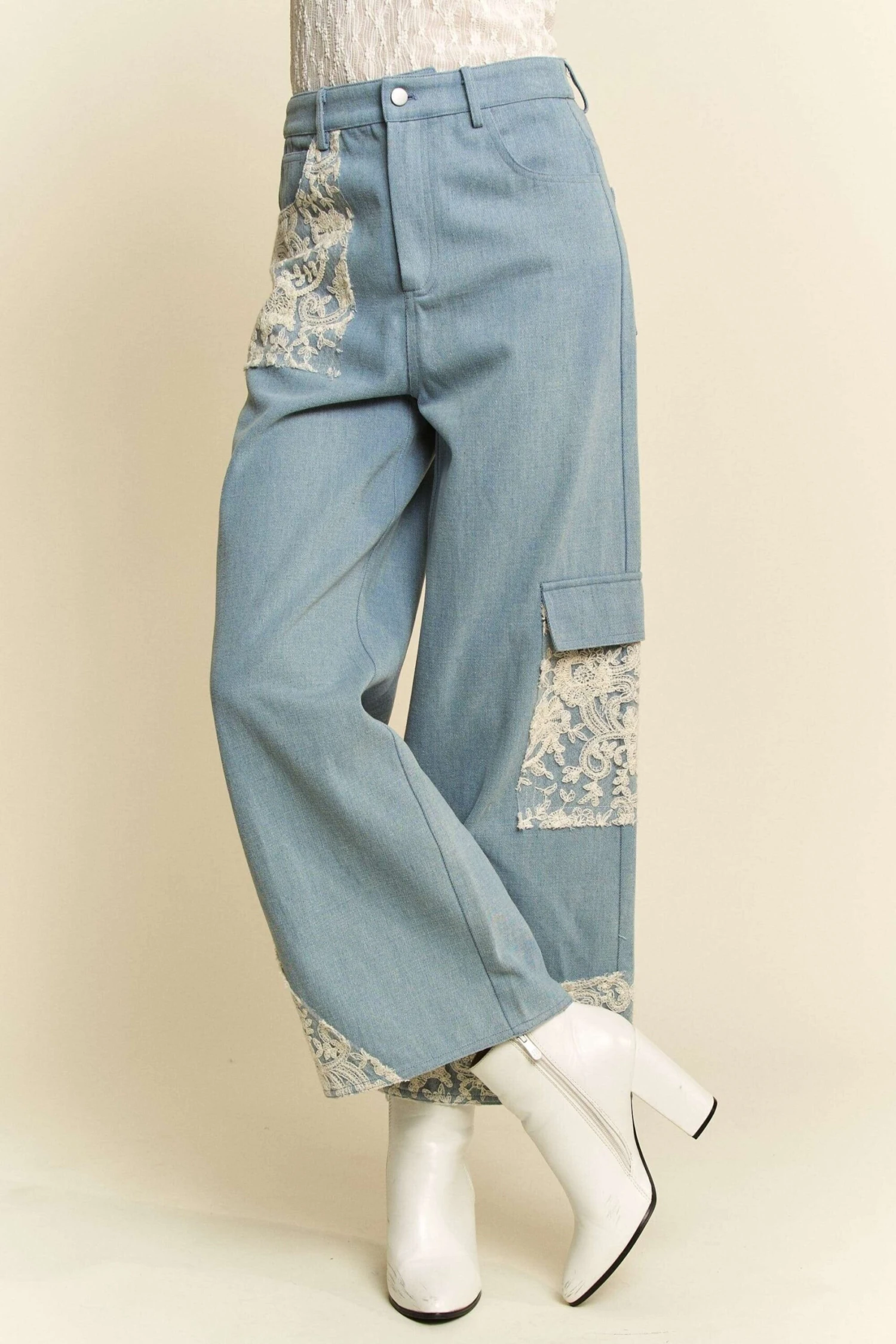 These Lace Applique Wide Leg Jeans are the perfect statement piece for any fashion-forward individual. The delicate lace detailing adds a touch of femininity to these trendy wide leg jeans. They are versatile and can be dressed up or down for any occasion. The wide leg silhouette offers a comfortable and flattering fit. These jeans are sure to turn heads and make you stand out from the crowd. Elevate your denim game with these unique and stylish Lace Applique Wide Leg Jeans.
