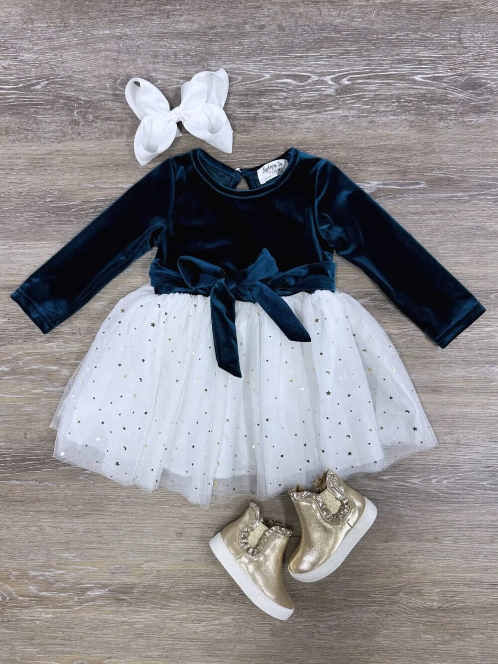 Elevate your child’s special occasions with our Emerald Velvet Chiffon Star Tutu Dress. This enchanting dress features an emerald velvet top that exudes elegance, paired with an attached white chiffon layered skirt adorned with sparkling stars. It’s the perfect choice for those memorable moments, providing a touch of magic and a twirl-worthy look that will make your child shine like a star. Pick up this seasonal outfit while your little’s size is still in stock and be sure to checkout our other new arrivals.