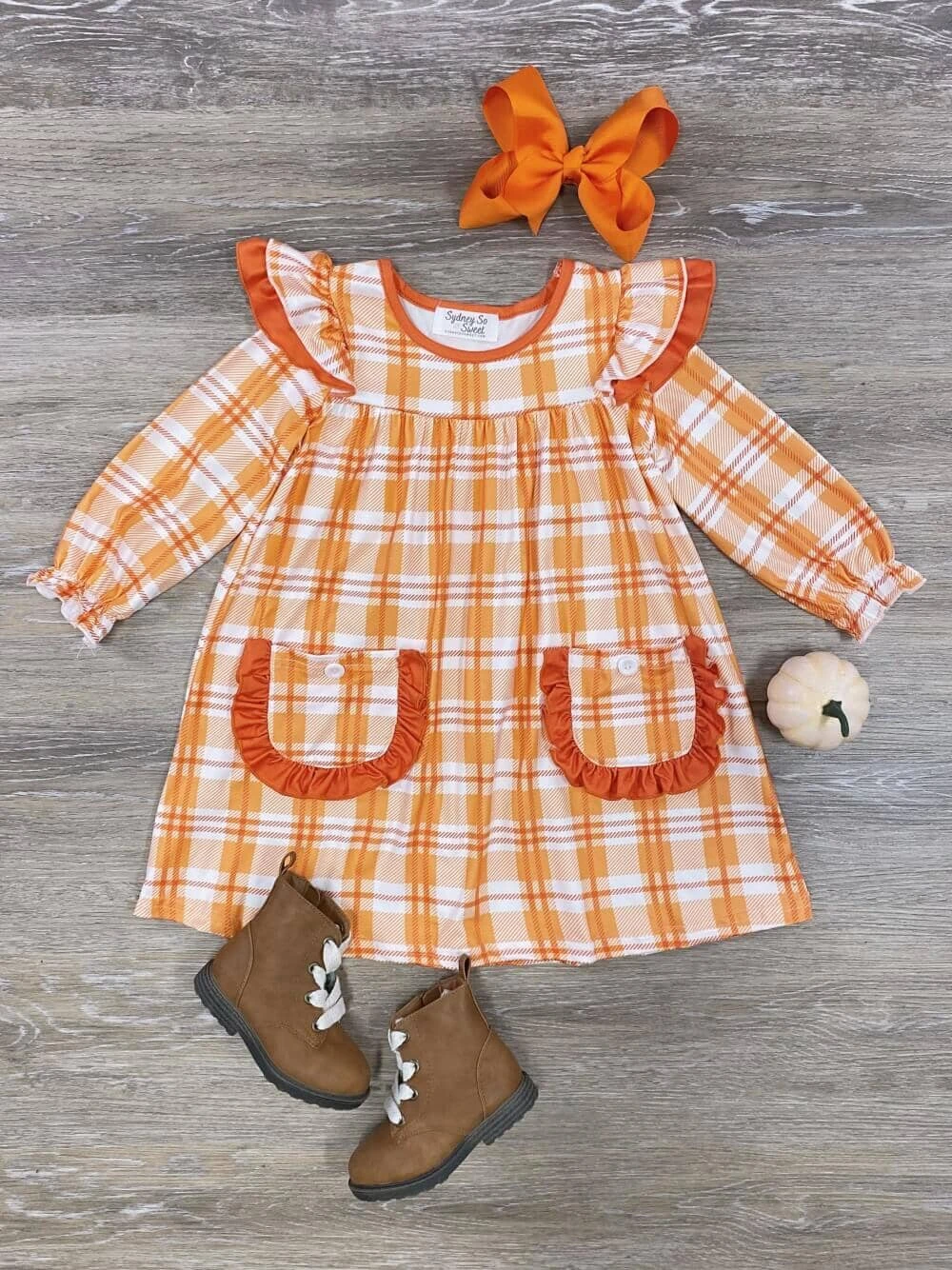 Embrace the autumn charm with our Fall in Love Orange Plaid Girls Ruffle Pocket Dress. This delightful ensemble showcases a captivating orange plaid pattern that perfectly captures the essence of the season. With charming ruffle accents and convenient pockets, this dress offers both style and functionality. It’s a must-have addition to her fall wardrobe, radiating warmth and grace wherever she goes. Pick up this fall outfit while your little’s size is still in stock and be sure to checkout our other new fall arrivals.