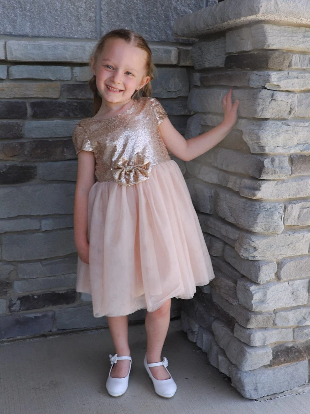 She’ll look absolutely golden in our new Golden Sequin Bow Tulle Fancy or Special Occasion Girls Tutu Dress! This pretty dress features a gold sequin short sleeve top, a pretty bow, and a fancy gold tulle skirt. She can wear this dress with a matching gold headband and some fancy shoes. This dress is perfect for fancy dinners, parties, and more. Pick up this pretty dress and check out the rest of our special occasion dresses.