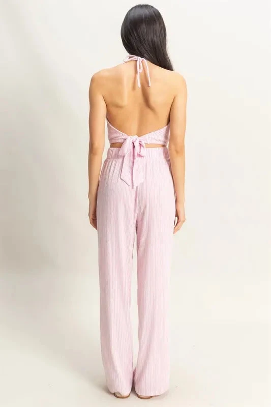 This set includes a stylish and versatile striped halter neck top paired with matching pants. The halter neck design adds a touch of sophistication, while the striped pattern adds a playful element to the ensemble. Perfect for various occasions, this set is a chic and effortless choice for a fashionable look.