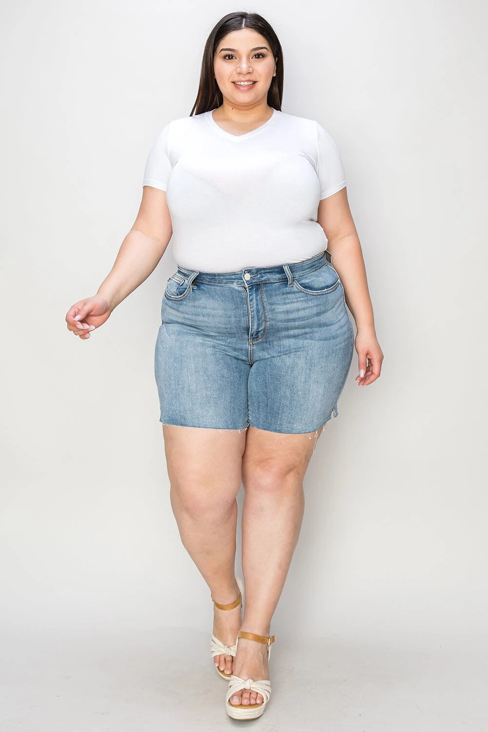 High Waist Raw Hem Denim Shorts are a must-have for the summer season. The high waist design is both stylish and flattering. The raw hem adds a touch of edge and casual charm to the shorts. Perfect for creating effortless and trendy outfits. These shorts can be easily dressed up or down for any occasion. Stay cool and stylish in these High Waist Raw Hem Denim Shorts!