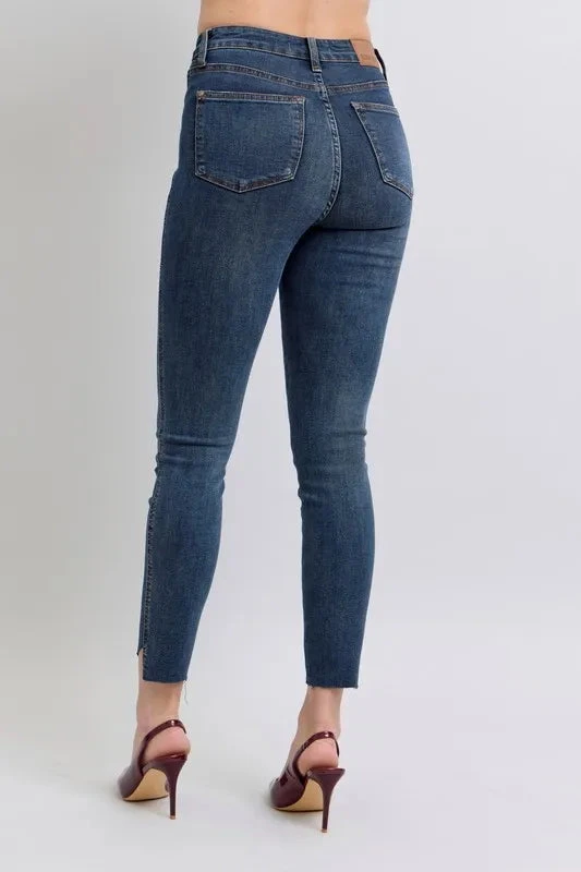 These high-waist tummy control step hem skinny jeans are a versatile and flattering addition to your denim collection. The high-waist design helps to shape and smooth the midsection for a more streamlined silhouette, while the skinny fit accentuates your curves. The step hem detail adds a trendy and modern touch to the classic skinny jeans. Pair these jeans with a fitted top or blouse for a stylish and polished look. Stay comfortable and confident in these high-waist tummy control step hem skinny jeans.