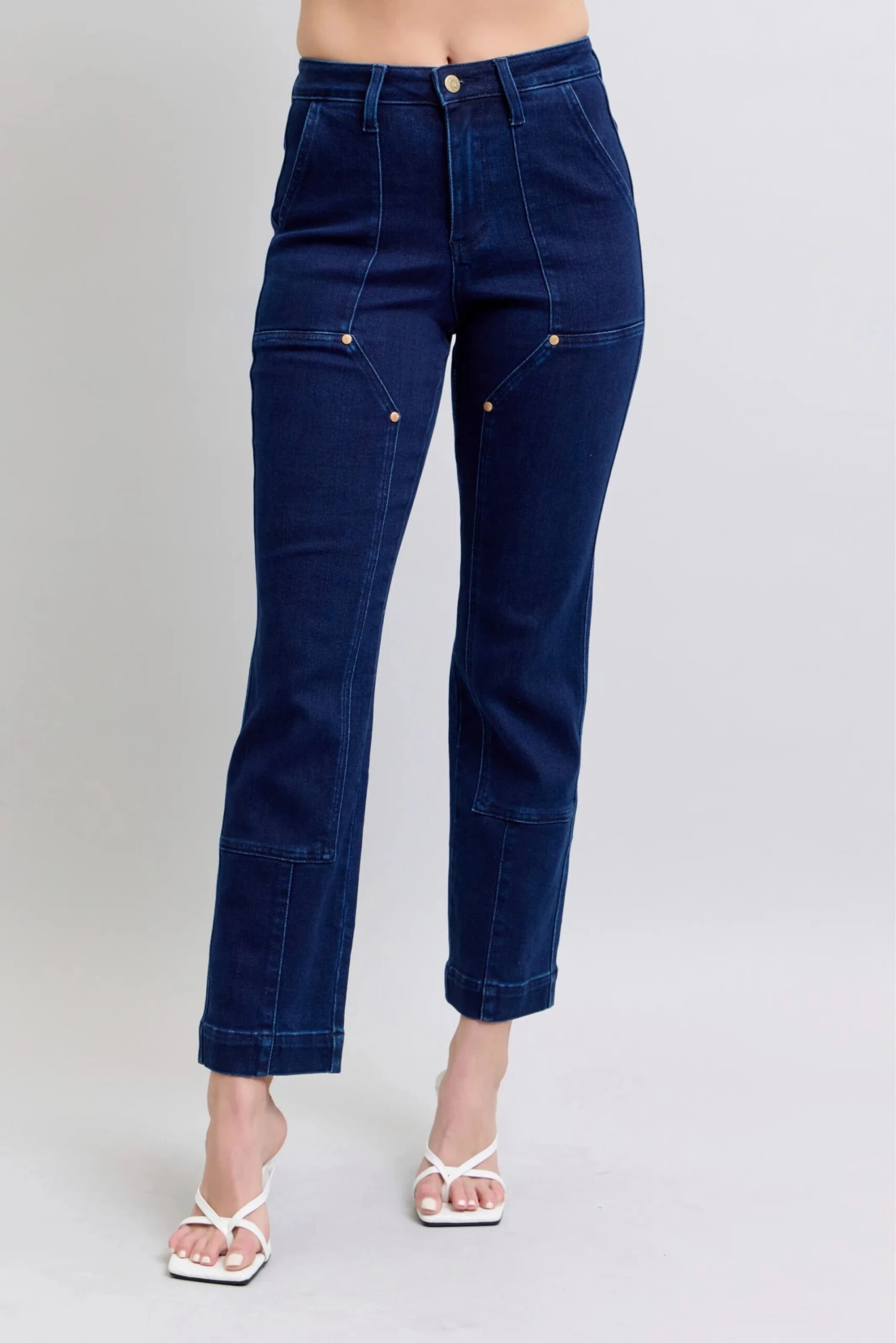 These premium high-waisted straight-leg jeans feature a sophisticated deep indigo wash crafted from high-quality denim blend with subtle stretch for all-day comfort. The standout design element includes carefully placed star-shaped metal studs that add a touch of edgy glamour without overwhelming the classic silhouette. The contrast stitching in complementary thread highlights the construction quality while the cropped ankle length offers modern versatility. Perfect for both casual and semi-dressy occasions, these jeans combine timeless denim appeal with contemporary details.