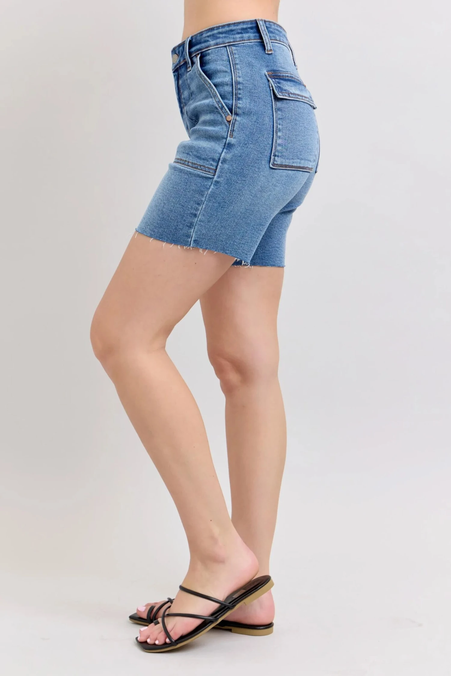 These versatile denim shorts feature a classic medium wash and contemporary raw hem design. Made from high-quality stretch denim material for optimal comfort and movement. The mid-rise waistline and front utility pockets create a flattering silhouette while maintaining functionality. The shorts include traditional 5-pocket styling, belt loops, and a secure summary and zip fly closure. The frayed edges add a modern, casual touch perfect for everyday wear. Ideal for summer styling and can be dressed up or down for various occasions.