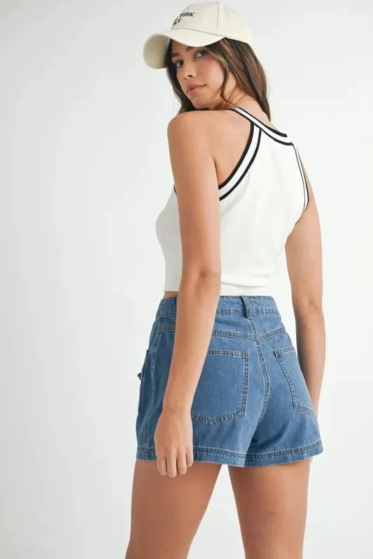 The contrast trim Grecian neck cropped tank is a trendy and chic choice for a modern outfit. The contrast trim detailing adds a bold and stylish touch to the tank, while the Grecian neck design brings a unique and sophisticated flair. Perfect for a night out or a fun event, this cropped tank exudes a fashion-forward and edgy vibe.