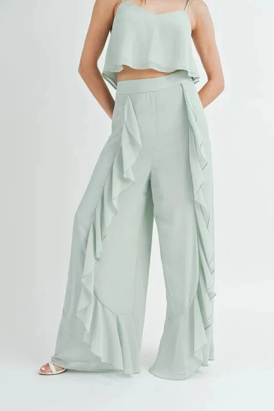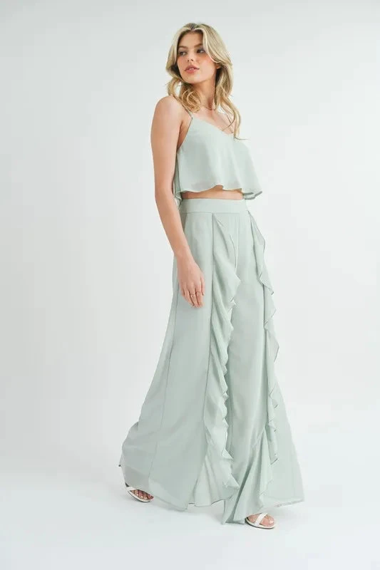 A crop cami and ruffled wide leg pants set is a chic and stylish ensemble that combines modern trends with feminine details. The crop cami adds a touch of casual sophistication, while the ruffled wide leg pants bring a fun and playful element to the outfit. This set is perfect for a variety of occasions, from casual outings to dressier events. Pair it with heels or wedges to dress it up, or opt for sneakers or sandals for a more relaxed look. Embrace the trendy and versatile appeal of this fashionable set!
