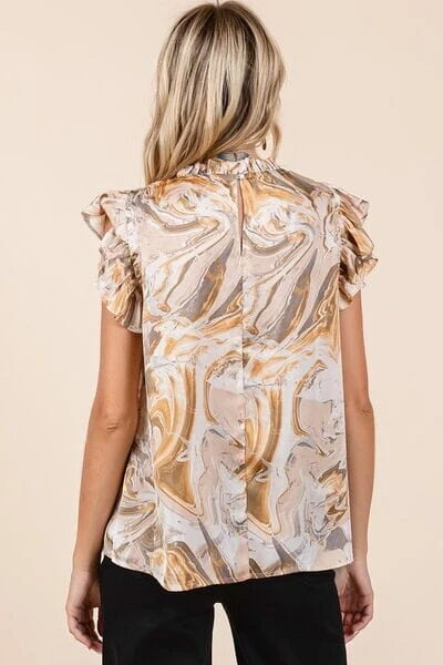 The Abstract Print Ruffle Short Sleeve Satin Top is a bold and stylish piece that combines artistic flair with luxurious fabric. Featuring an abstract print, this top adds a modern and trendy touch to any outfit. The ruffle detailing brings a playful and feminine element to the design, adding dimension and movement. Crafted from satin fabric, this top offers a sleek and elegant look with a subtle sheen. The short sleeves provide a comfortable and versatile style that can be dressed up or down. Pair this top with tailored pants or a skirt for a chic and fashion-forward ensemble that’s sure to turn heads. Make a statement with the Abstract Print Ruffle Short Sleeve Satin Top as a standout addition to your wardrobe.