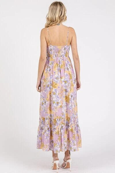 The Floral Smocked Back Ruffled Hem Maxi Cami Dress is a charming and feminine piece that exudes bohemian elegance. The floral print adds a whimsical touch, while the smocked back ensures a comfortable and flattering fit. The ruffled hem detail creates a romantic and flowy silhouette, making this dress perfect for a variety of occasions, from summer picnics to beach outings. Pair it with strappy sandals and delicate jewelry for a boho-chic look that captures the essence of effortless style.