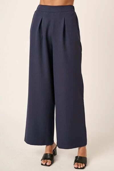 Inverted pleat detail wide leg pants are pants that feature pleats that are folded in the opposite direction of traditional pleats, creating a unique and stylish design detail. The wide leg cut of the pants adds a flowy and relaxed silhouette, making them comfortable and fashionable for various occasions. These pants are versatile and can be paired with a variety of tops for a chic and sophisticated look.