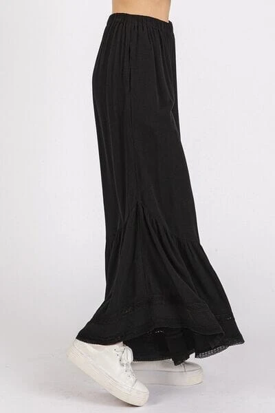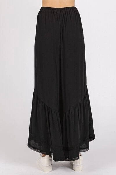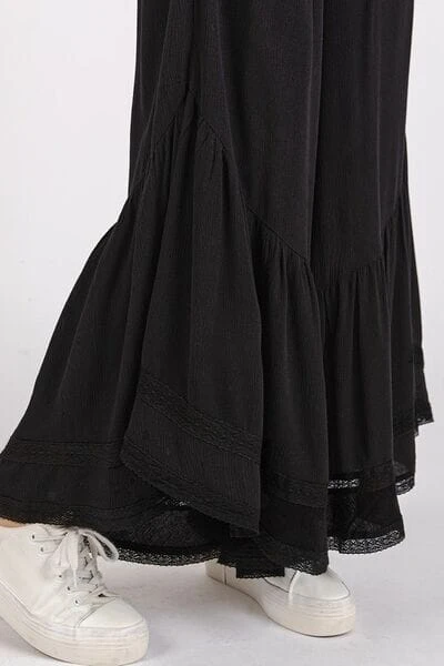 The Lace Ruffle Asymmetric Hem Wide Leg Pants are a feminine and elegant choice for any occasion. The delicate lace detailing adds a romantic touch to the design. Featuring a tiered ruffle hem and wide-leg silhouette, these pants offer a flattering and flowy fit. The asymmetric hem adds a modern and stylish element to the overall look. Whether dressed up with heels or styled casually with sandals, these pants are sure to make a statement.
