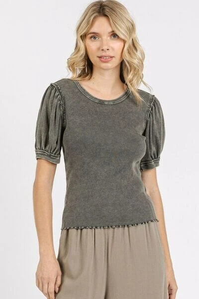This rib knit top features a unique mineral wash finish with puff sleeves and lettuce edge detailing for a stylish and trendy look. The mineral wash adds a cool and edgy vintage touch to the ribbed fabric, giving it a worn-in appearance. The puff sleeves add a feminine and fashion-forward element, while the lettuce edge trim provides a textured and playful finish. Perfect for adding a touch of character to your outfit, this top is versatile and chic. Pair it with high-waisted jeans or a skirt for a fashion statement that stands out. Elevate your style with this mineral wash puff sleeve lettuce edge rib knit top!