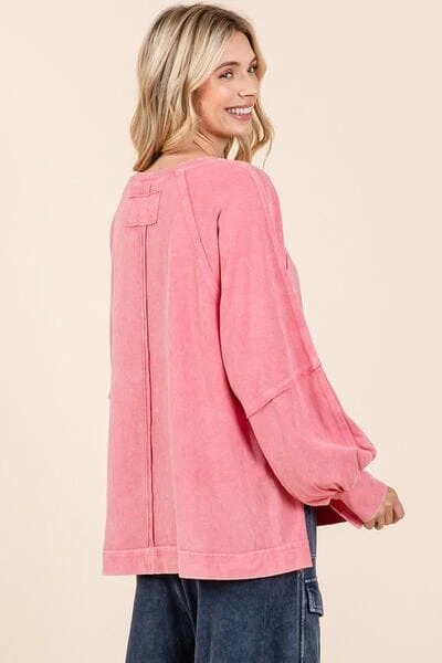 The Mineral Wash Raglan Long Sleeve Oversized Top is a comfortable and stylish addition to your casual wardrobe. With its mineral wash finish, this top has a trendy and edgy look that sets it apart from basic long sleeve tops. The raglan sleeves add a sporty touch to the oversized silhouette, creating a laid-back and effortless vibe. Made from soft and cozy material, this top is perfect for lounging or running errands in ultimate comfort. Pair it with leggings or jeans for a relaxed and chic outfit that’s easy to throw on for any occasion. Elevate your everyday style with the Mineral Wash Raglan Long Sleeve Oversized Top as a versatile and on-trend staple.