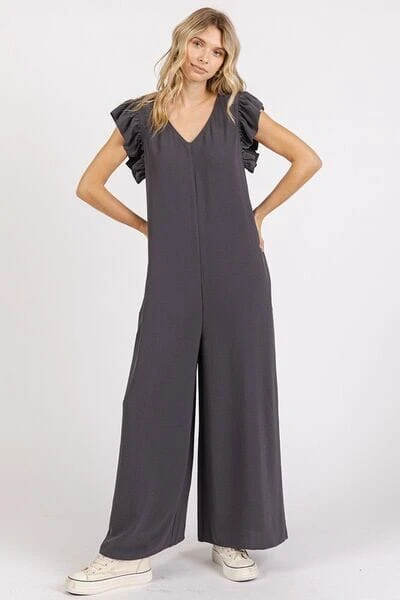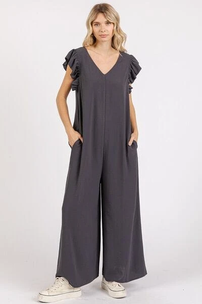 The V-Neck Ruffled Cap Sleeve Wide Leg Jumpsuit is a stylish and chic one-piece outfit that combines a flattering V-neckline, feminine ruffled cap sleeves, and wide-leg pants. This jumpsuit offers a modern and sophisticated look, perfect for various occasions from casual outings to special events. The V-neck detail adds a touch of elegance, while the wide-leg silhouette lends a trendy appeal. Pair this jumpsuit with heels and statement jewelry for a polished ensemble that will make you stand out.