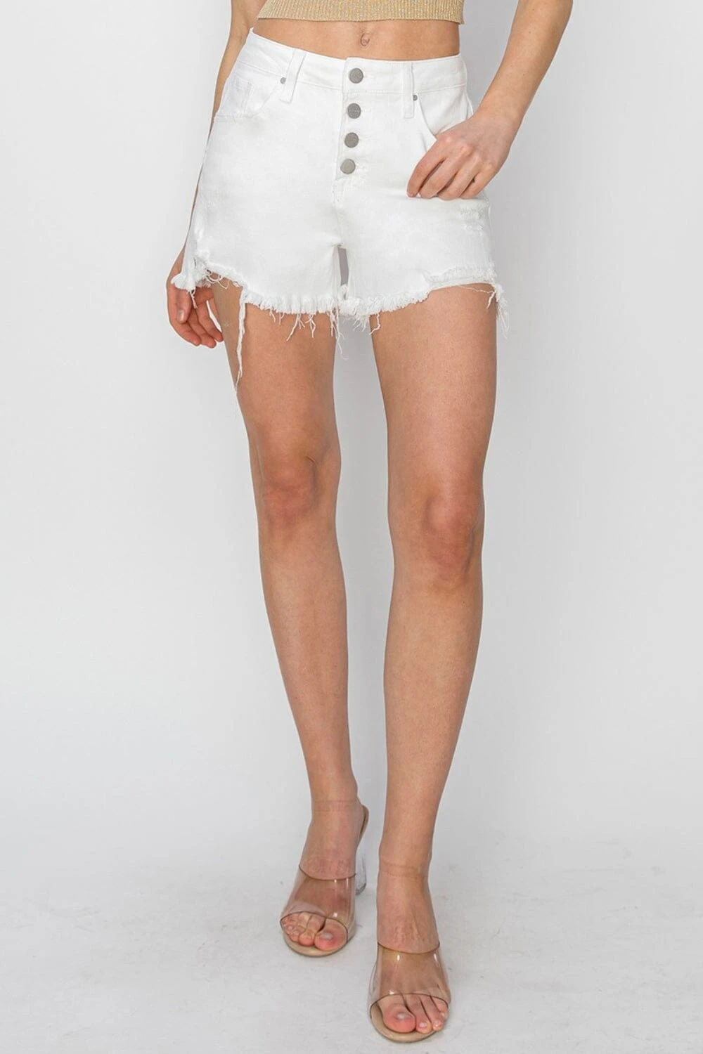 The Button Fly Frayed Hem Denim Shorts are a chic and on-trend choice for the summer. With a stylish summary fly closure and frayed hem detailing, these shorts offer a fashionable and edgy look. Made from quality denim material, they provide both comfort and durability for all-day wear. Pair them with a cropped tee and sneakers for a casual vibe, or dress them up with a blouse and wedge sandals for a more elevated outfit. The frayed hem adds a touch of casual charm to these versatile shorts, making them a staple in your wardrobe. Elevate your summer style with these trendy and stylish summary-fly frayed hem denim shorts.