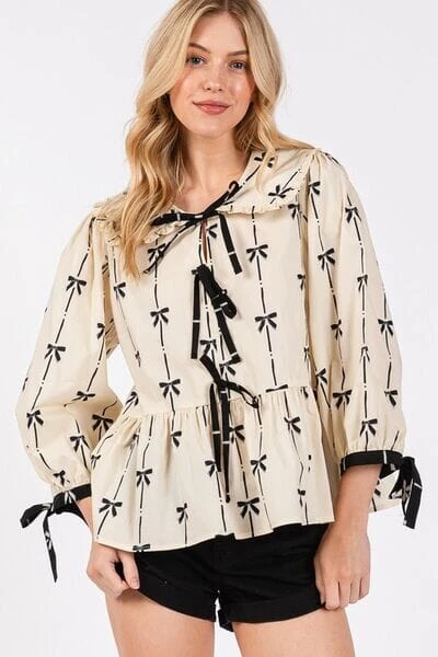 The Bow Print Tie Front Babydoll Blouse is a charming and feminine piece that exudes a playful and romantic vibe. Featuring a delightful bow print pattern and a tie front detail, this blouse adds a touch of whimsy to your wardrobe. With its babydoll silhouette and flowy design, it is perfect for creating a cute and chic look. Whether paired with jeans for a casual outing or dressed up with a skirt for a more polished ensemble, this blouse is versatile and eye-catching.