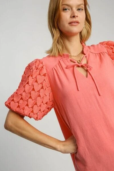 Add a touch of romance to your look with the Heart Lace Sleeves Ruffle Stand Collar top. This charming top features delicate heart lace sleeves that bring a whimsical and feminine touch to the design. The ruffle stand collar adds a sophisticated and elegant element, perfect for dressing up any outfit. Elevate your style with this unique and stylish top that exudes timeless charm and sophistication.
