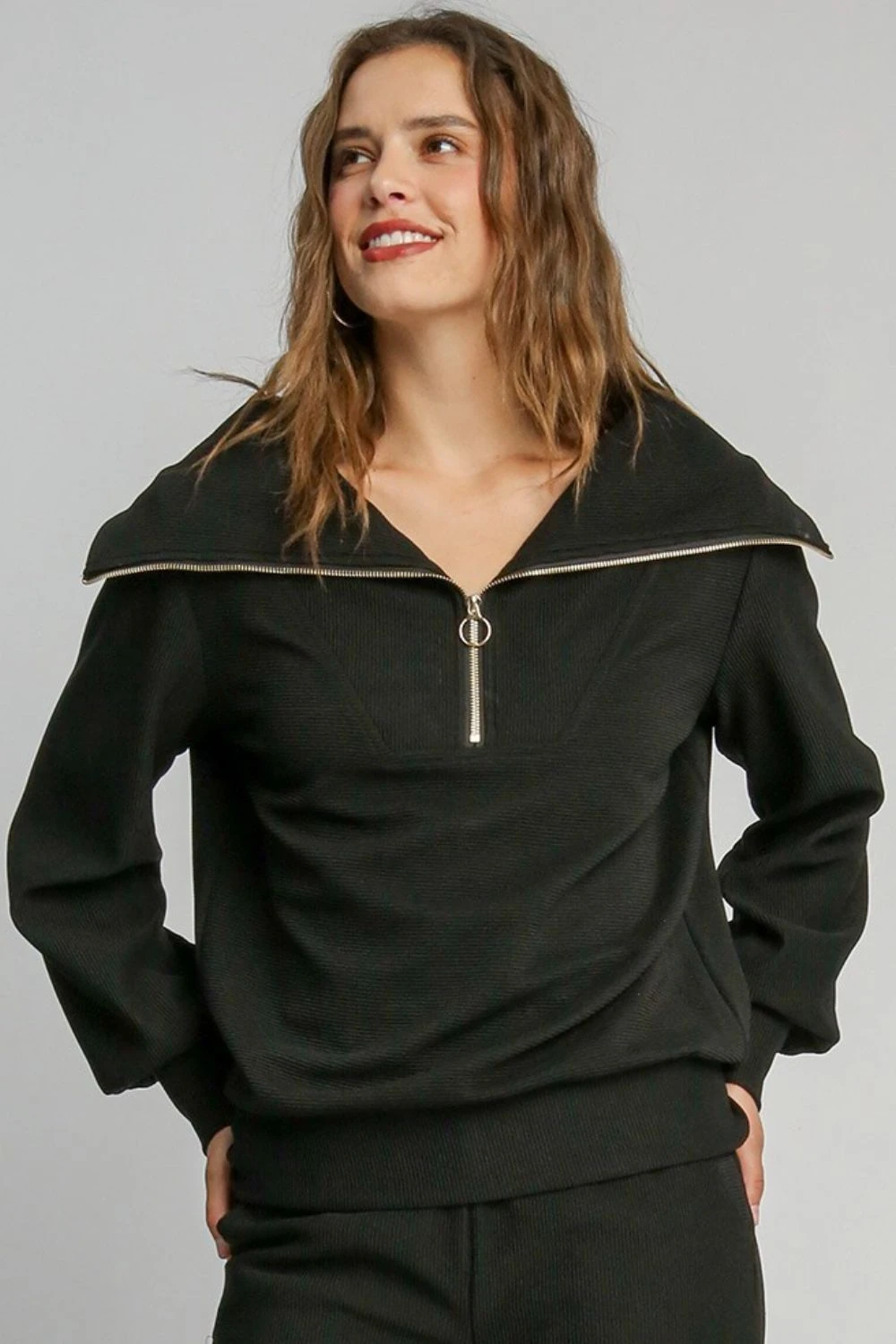 Stay cozy and stylish in this ribbed knit sweatshirt featuring a trendy half-zipper design. Perfect for layering or wearing on its own for a casual, comfortable look. The ribbed texture adds a touch of sophistication to this versatile piece.