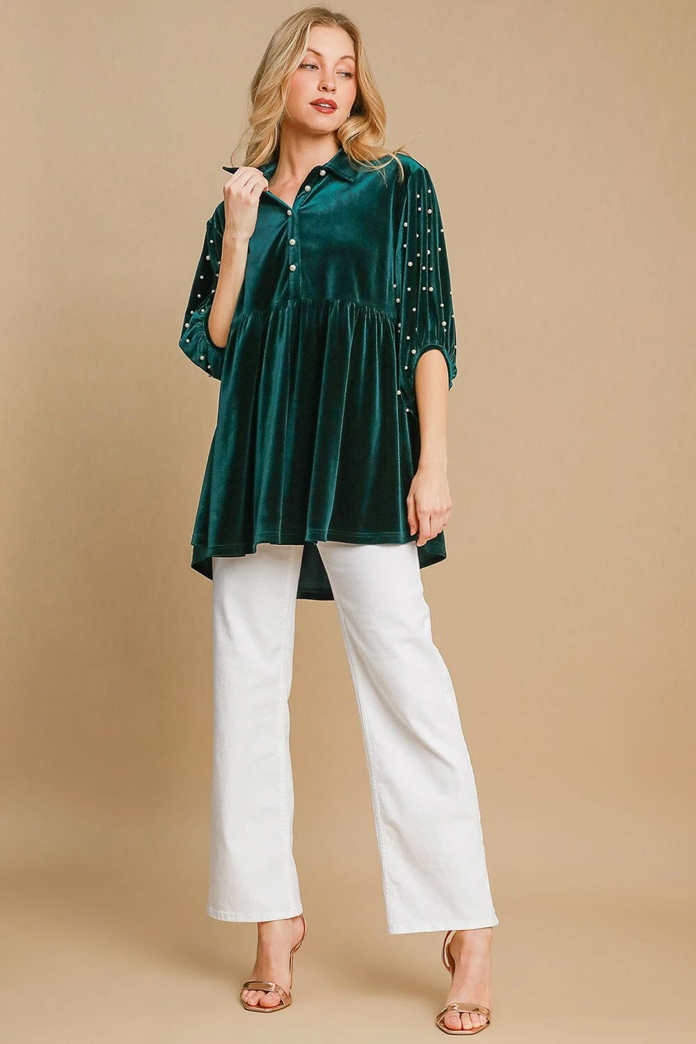 The Pearl Detail Half Sleeve Velvet Babydoll Top is a stylish and feminine top featuring a babydoll silhouette with pearl embellishments. The soft velvet fabric adds a touch of luxury and elegance to the design, while the half sleeves offer a flattering look. The pearl detailing adds a sophisticated and charming touch to the top, making it perfect for both casual and dressy occasions.