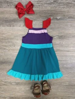 Our Under the Ocean Girls Mermaid Princess Dress is perfect for magical summer adventures. Featuring ocean blues, a purple-toned bodice, and bold red ruffle straps, this twirl-ready dress was made for theme parks, birthday parties, and beachside fun. A must-pack for your next vacation or seaside celebration—because every little girl deserves to feel like royalty! And be sure to check out our other must have new arrivals.